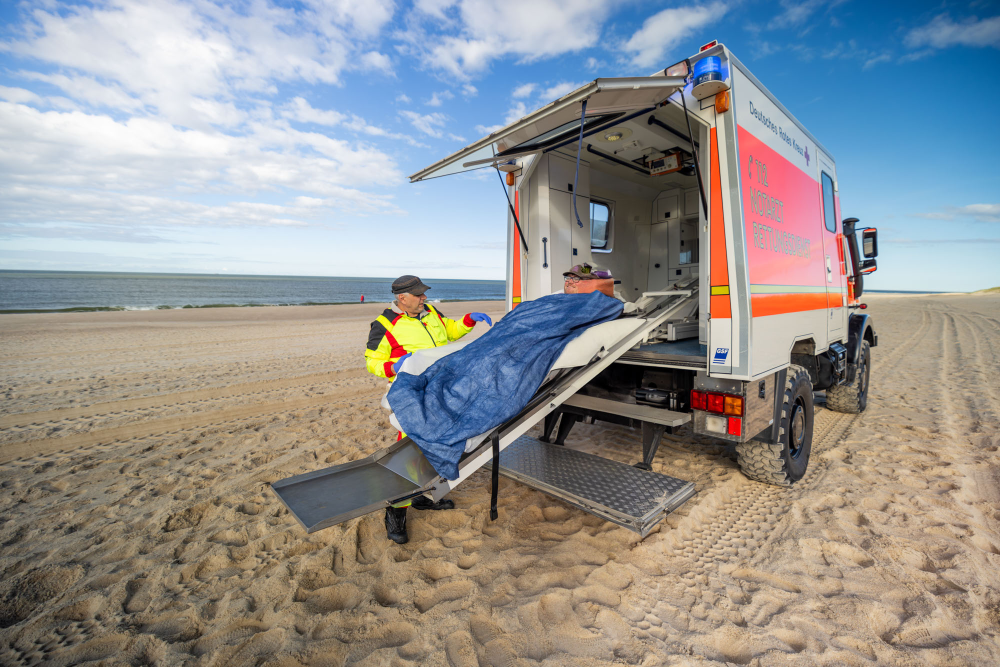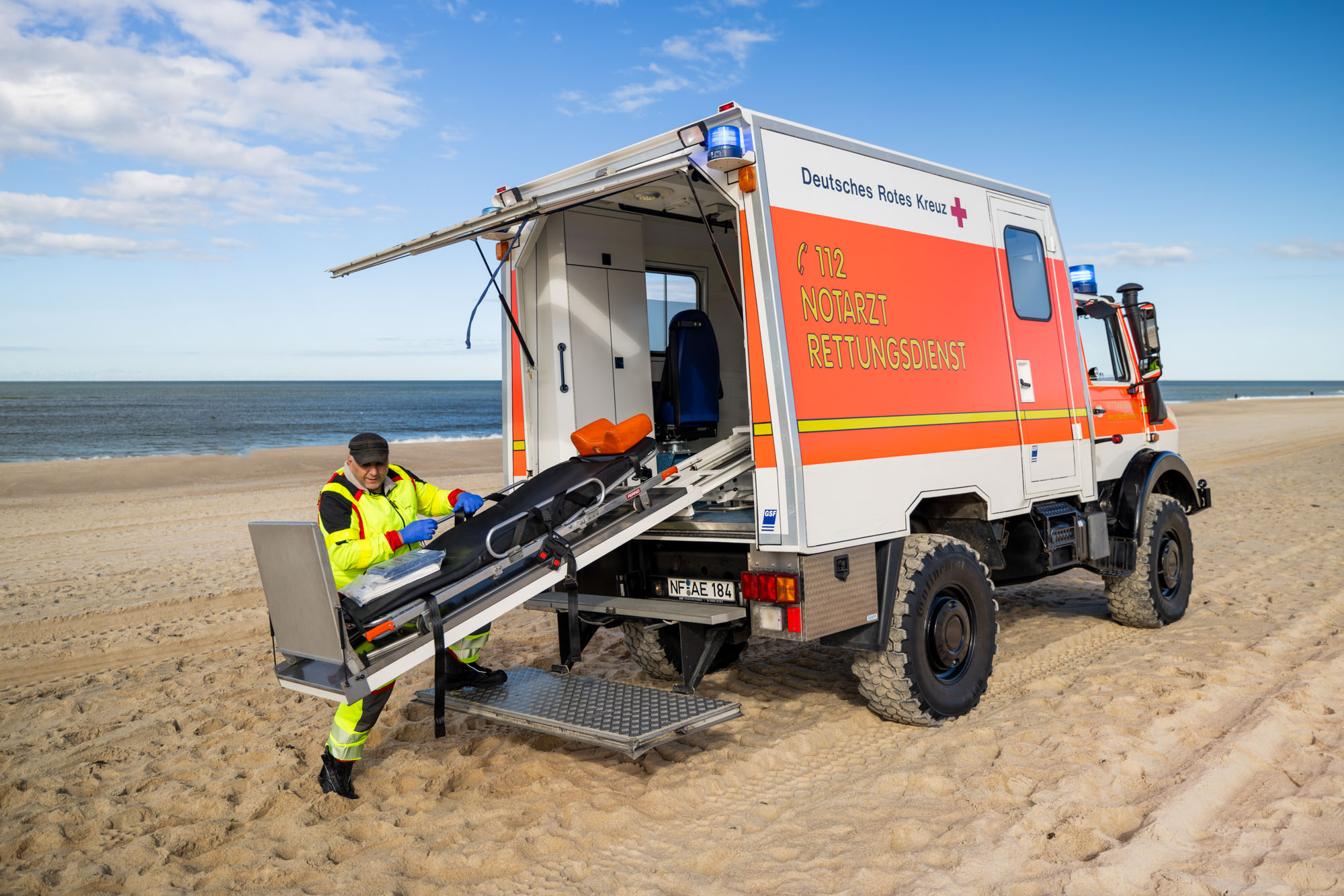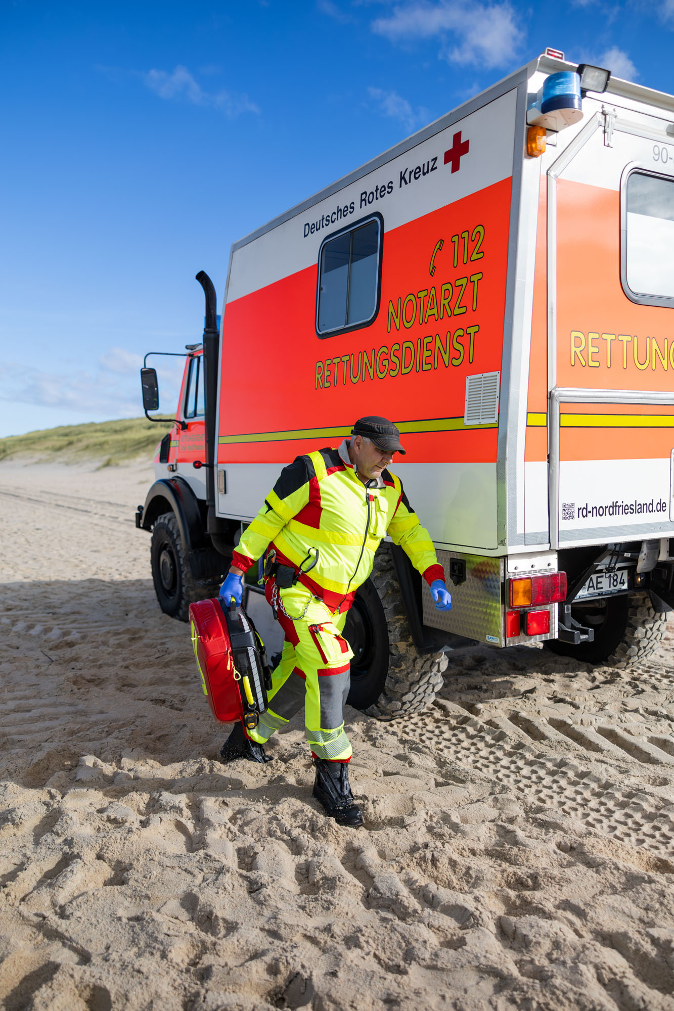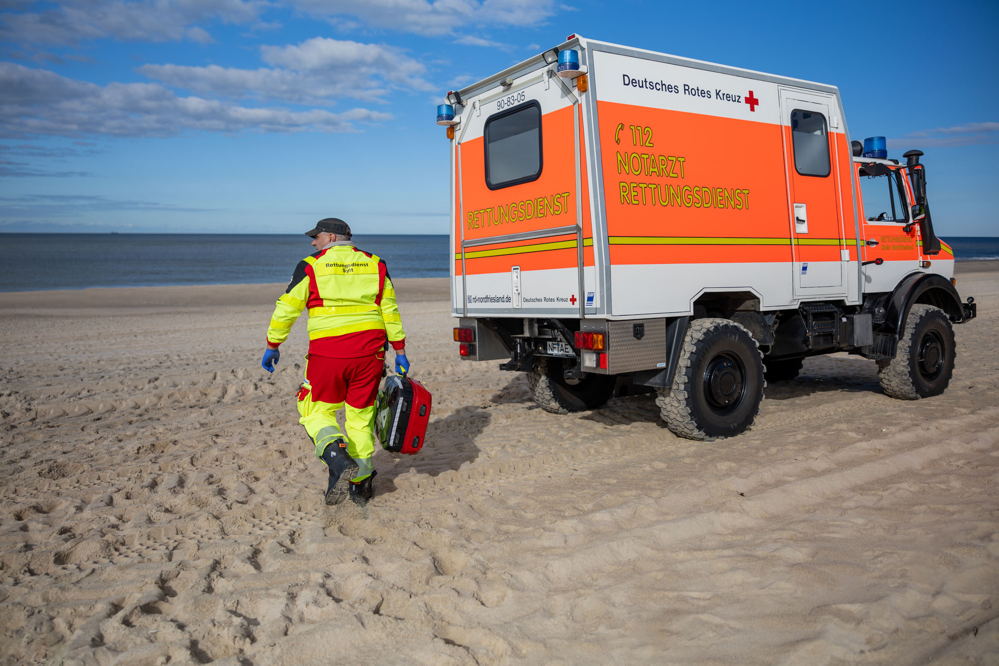 Der besonderen Situation einer Urlaubsinsel wie auch den landschaftlichen Gegebenheiten – sprich Strandeinsätze – wird das DRK mit kompetentem Personal und einer umfassenden Ausstattung gerecht. Dass Qualitätsniveau wie Ausstattung über der Norm liegen, hat seinen guten Grund: Bevor bei Unglücken größeren Ausmaßes Hilfe vom Festland eintreffen würde, ist der Sylter Rettungsdienst auf sich allein gestellt. Neben Rettungswagen und Notarzteinsatzfahrzeugen verfügt der Rettungsdienst über einen geländegängige Unimog für Einsätze am Strand. Das Team des Rettungsdienstes besteht aus 30 hauptamtlichen sowie 30 neben-/ehrenamtlichen Mitarbeiter/innen.